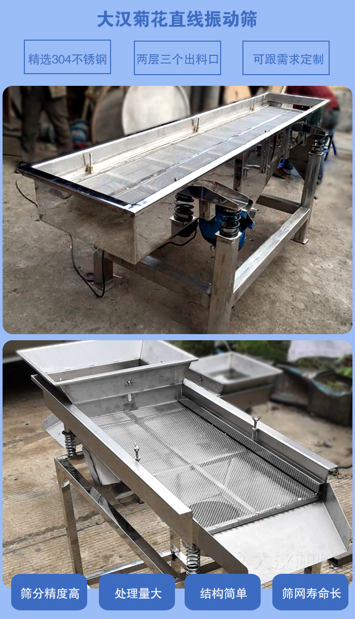 菊花為菊科植物的干燥頭狀花序。主產(chǎn)于浙江、安徽、河南等地。9-11月花盛開時(shí)分批采收,陰干或焙干,或熏、蒸后曬干。生用。藥材按產(chǎn)地和加工方法不同,分為“亳菊”、“滁菊”、“貢菊”、“杭菊”等。由于又有花的顏色不同,又有黃菊花和白菊花之分。 菊花在做成成品之前,需要進(jìn)行除雜分級(jí)。這時(shí)候就需要用到直線振動(dòng)篩,菊花直線振動(dòng)篩篩分精度高,處理量大,結(jié)構(gòu)簡(jiǎn)單,篩網(wǎng)使用壽命長(zhǎng),下面有菊花直線振動(dòng)篩廠家大漢機(jī)械為您具體介紹一下菊花直線振動(dòng)篩: