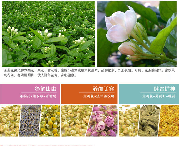 茉莉花茶產(chǎn)于廣西橫縣,其茶香與茉莉花香交互融合,有“窨得茉莉無上味,列作人間第香”的美譽。新中國成立以來,橫縣茉莉花茶直是國家的外事禮茶。茉莉花茶是將茶葉和茉莉鮮花進行拼和、窨制,使茶葉吸收花香而成的茶 。其香氣鮮靈持久、滋味醇厚鮮爽、湯色黃綠明亮、葉底嫩勻柔軟。經(jīng)過系列工藝流程窨制而成的茉莉花茶,具有安神、解抑郁、健脾理氣、抗衰老防輻射、提高機體免疫力的功效,是種健康飲品。
