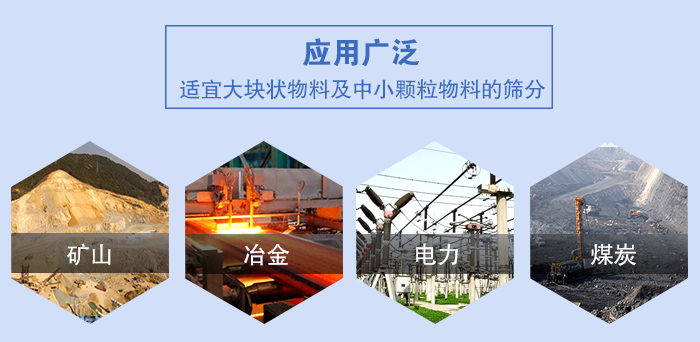 應用范圍:主要用于冶金、礦山、煤炭、建材、電力、化工等大塊狀物料及中小顆粒物料的篩分行業