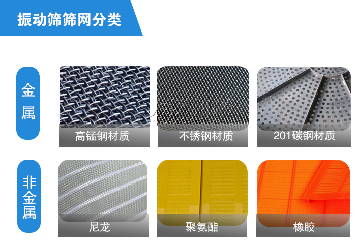 振動篩篩網的材質主要分為金屬的和非金屬兩種,金屬材質包括201碳鋼材質、不銹鋼材質、高錳鋼材質等。非金屬材質的篩網則多用橡膠、尼龍、聚氨酯等為原材料制成。