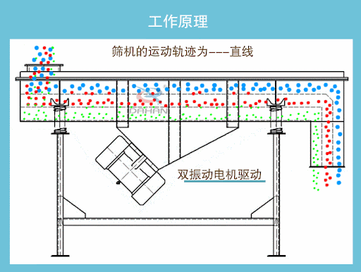 不銹鋼直線振動(dòng)篩工作原理可分為動(dòng)力來源、運(yùn)動(dòng)傳遞、物料分離三個(gè)環(huán)節(jié),雙軸振動(dòng)電機(jī)為設(shè)備提供動(dòng)力、篩體作直線往復(fù)振動(dòng)進(jìn)行動(dòng)力傳遞,在直線振動(dòng)和篩面傾角的共同作用下,會(huì)經(jīng)歷分層-透篩-分離的過程。